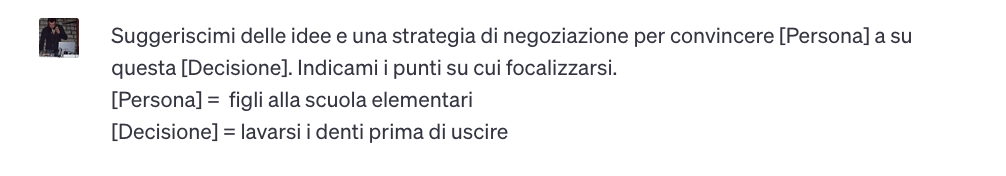 Suggeriscimi delle idee e una strategia di negoziazione per convincere [Persona] a su questa [Decisione]. Indicami i punti su cui focalizzarsi.