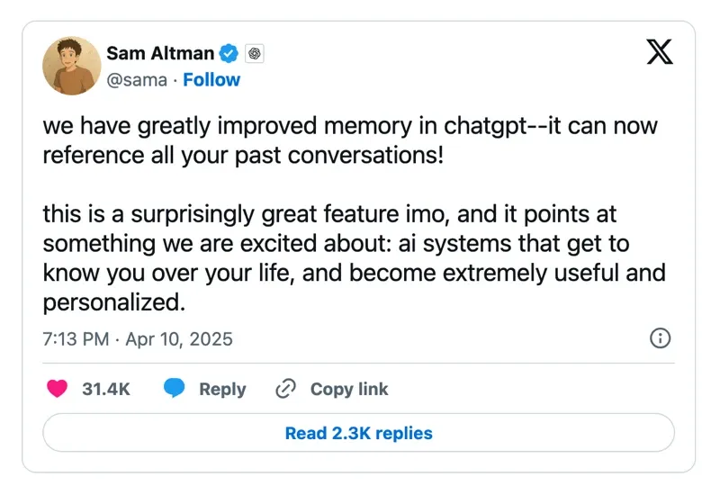 Sam Altman / Open AI: "Abbiamo migliorato notevolmente la memoria di chatgpt: ora può fare riferimento a tutte le vostre conversazioni passate!