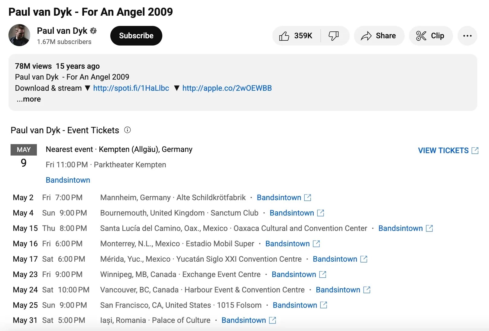 Sotto i video musicali è collegato il calendario degli eventi dell'artista.
