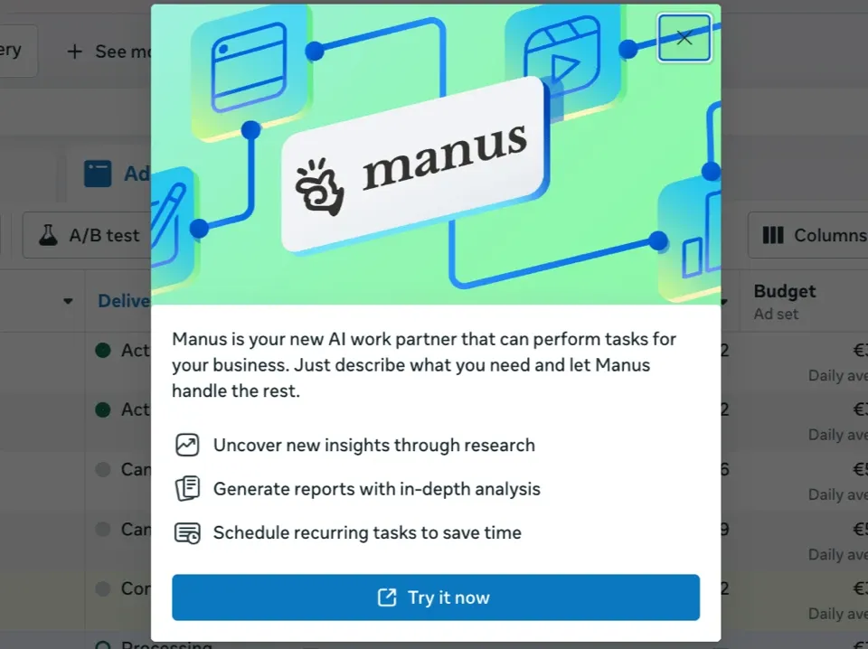 Dal Backend di Meta Ads mi è apparso un notifica a usare Manus. Nonostante le promesse cliccando ti porta al sito di manus e non ho ricevuto nessuna notifica di onboarding. Ma probabilmente arriva presto.