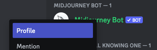 - Cerca il Midjourney bot, clicca tasto destro e seleziona "Profile".